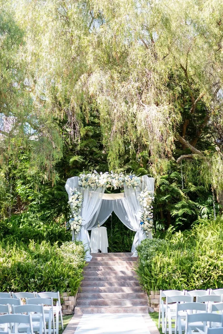 The Garden Ceremony Site is intimate and shaded, framed by mature trees. Guests walk along winding garden paths and past water features add a soft background ambiance. It’s ideal for smaller weddings, offering privacy in a natural setting.